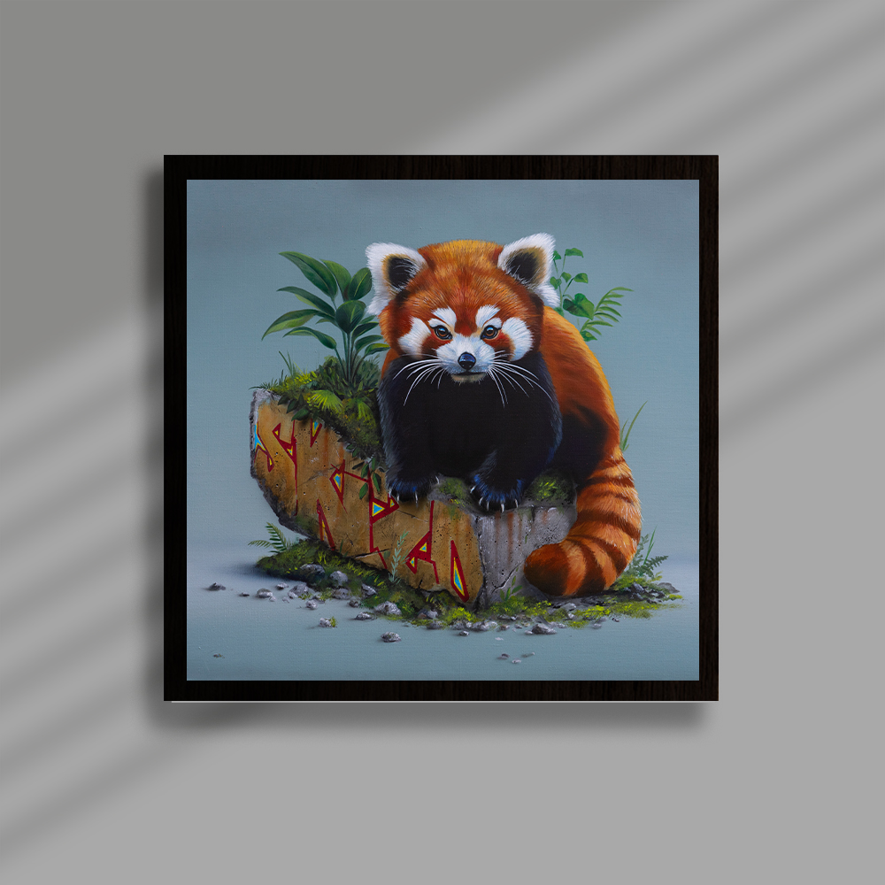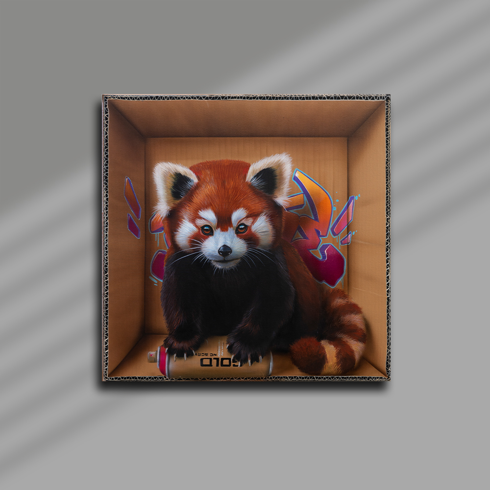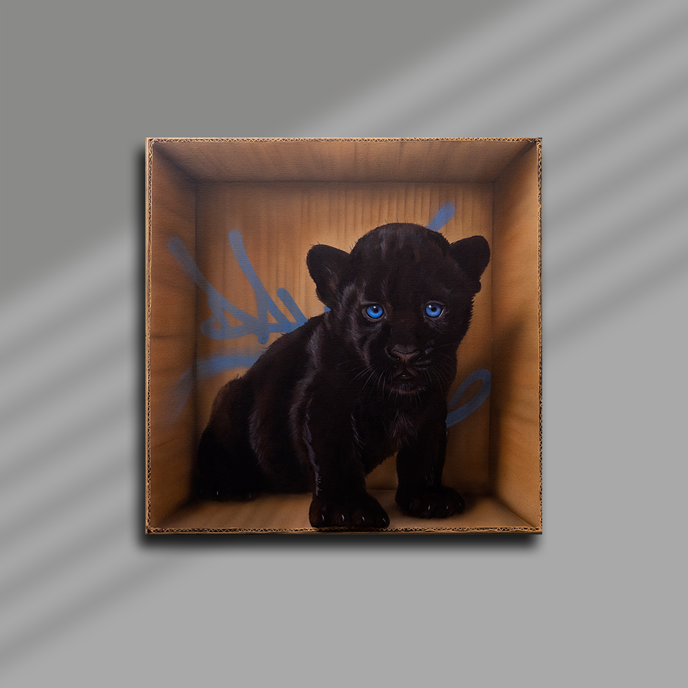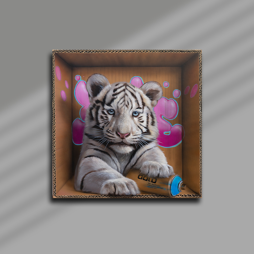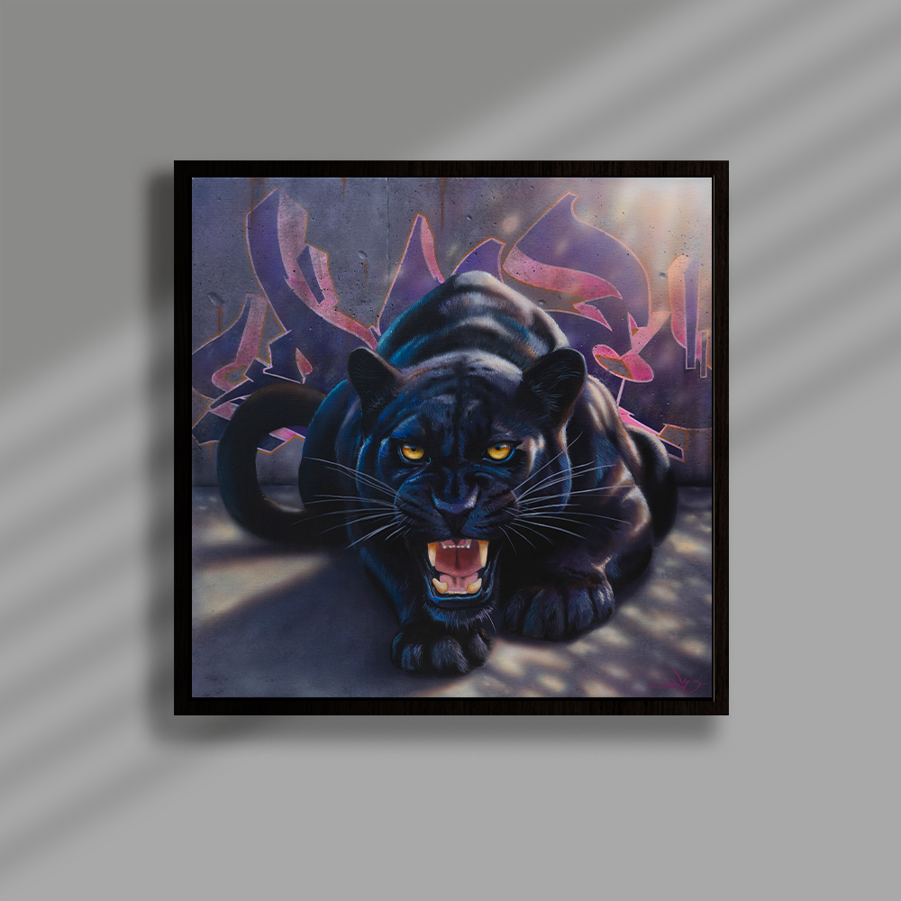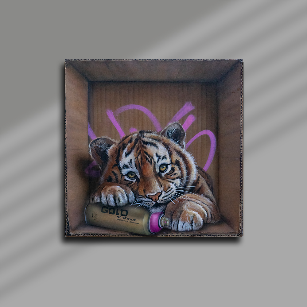 Sur toile, son travail se déploie aujourd’hui dans un dialogue singulier entre univers urbain et figures animales puissantes. Acrylique et aérosol se mêlent pour créer des paysages picturaux où textures minérales, signes graphiques et fragments de graffiti évoquent l’énergie de la ville. Dans ces environnements denses, les animaux, souvent des félins, apparaissent avec une présence saisissante, leurs regards captant immédiatement celui du spectateur.